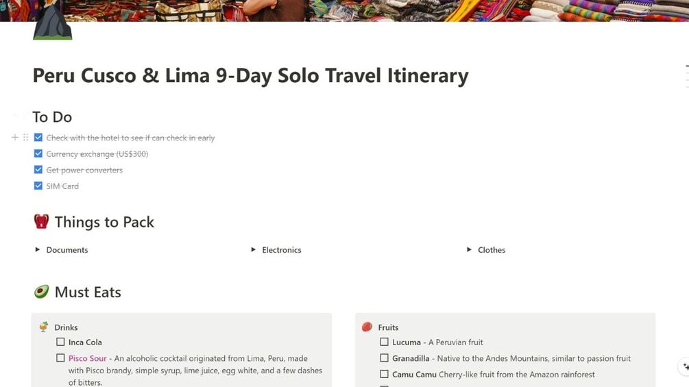 You'll get an all-in-one Notion template that simplifies your Peru trip organization, from creating itineraries and managing bookings to tracking expenses and collaborating with others.
